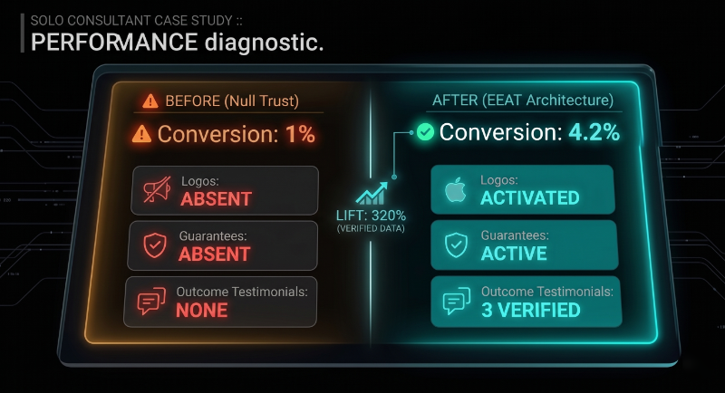 A solo consultant had a strong offer and good copy. Conversion was sitting under 1%. The page had no testimonials, no recognisable logos, no risk reducer — just a well-written explanation of what they did.