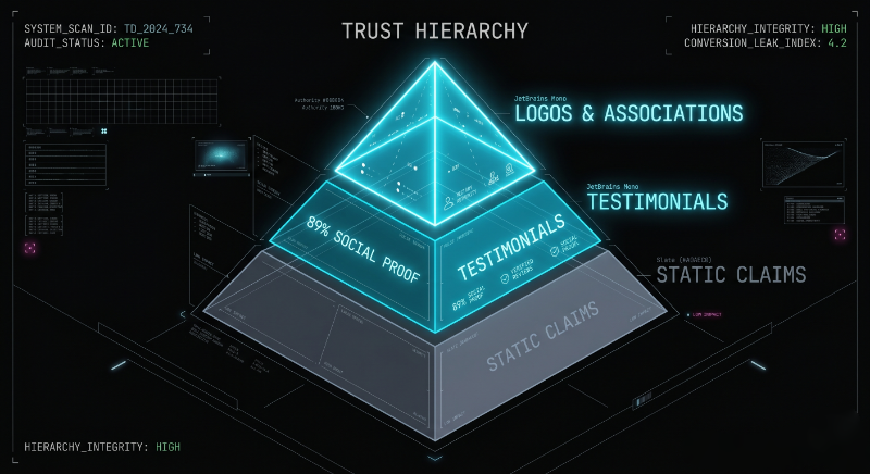 The trust hierarchy runs like this: logos and recognisable associations beat outcome-specific testimonials, outcome-specific testimonials beat direct claims, and direct claims beat nothing. Most pages lead with claims. The pages that convert lead with proof.