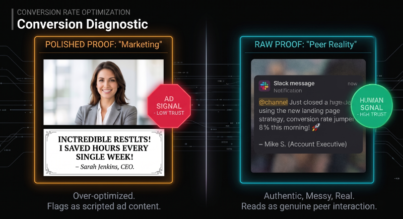 Here's something most conversion advice won't say: highly produced social proof can erode trust rather than build it.