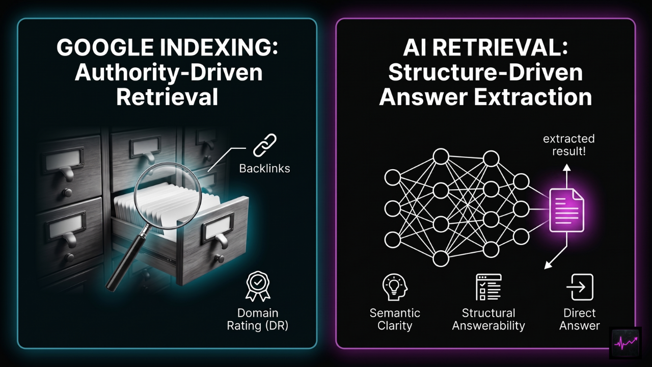 If my page ranks on Google, why isn't it being cited by AI engines? Because they use different retrieval logic. Google weighs authority signals. AI engines retrieve from content structure — clear headings, direct answers, entity clarity. A page can be strong on one system and invisible to the other.