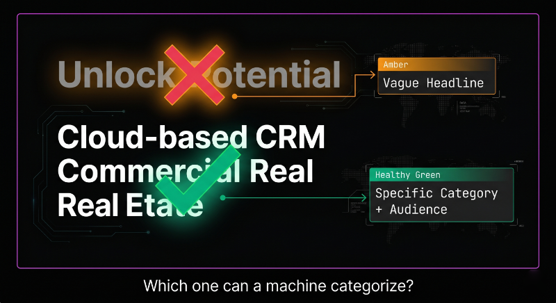 I see this constantly on SaaS pages. The headings are designed to sound compelling to a human reader. "Supercharge your growth." "Work smarter." These headings are invisible to AI retrieval — they carry no semantic information. A machine reading that heading has no idea what the product does.